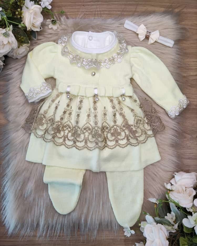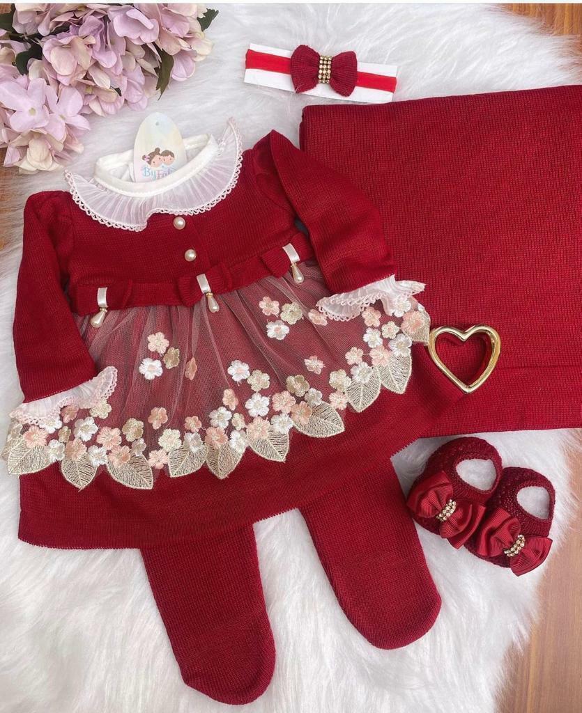 - 1 vestido em tricô antialérgico, aplicação em renda, laços e pérolas
